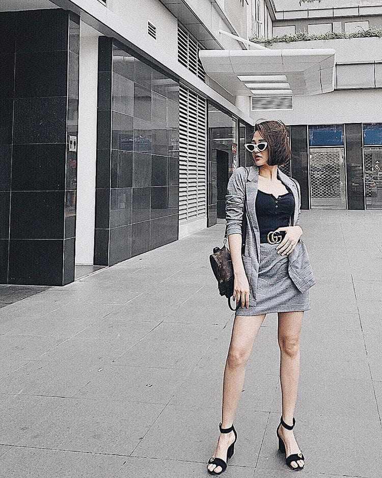 Chân váy chữ A với dáng siêu ngắn cũng là món đồ được Bảo Anh yêu thích và thường xuyên sử dụng.Cô nàng kết hợp giữa áo thun gợi cảm bên trong cùng với vest khoác ngoài đầy cá tính.