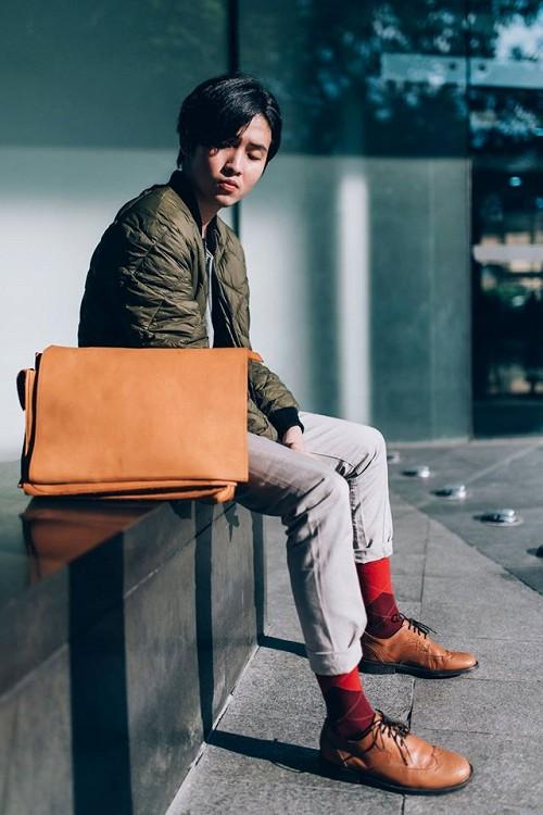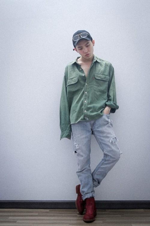 Style áo để ngoài quần không hề luộm thuộm nếu như bạn biết cách kết hợp tinh tế như Khang He. Kể cả là áo xanh giày đỏ đi chăng nữa cũng không làm khó anh chàng.