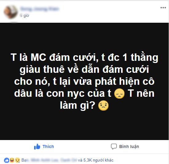 Trong một nhóm "tám chuyện" trên Facebook, mới đây, anh chàng có tài khoản tên là S.J.K đã khiến các cư dân mạng vừa thương vừa buồn cười vì tình huống khó đỡ của mình. K là một MC đám cưới. Những tưởng được mối làm ăn ngon khi được một thiếu gia nhà giàu mời về dẫn đám cưới cho họ, niềm vui chưa kịp đến đã vụt tắt. Bởi cậu bạn phát hiện ra, cô dâu của bữa tiệc chính là người yêu cũ của mình.