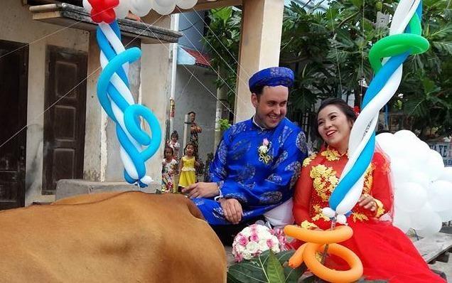 Chú rể người ngoại quốc rước dâu bằng xe bò khiến nhiều người thích thú.