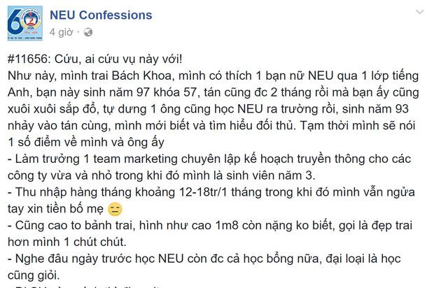 Mới đây, một chàng sinh viên Bách Khoa đã ôm cả bầu tâm sự ấy lên NEU Confessions, nhờ dân mạng mách bí quyết cạnh tranh để có được cô gái mình yêu từ tay một tình địch nặng ký.