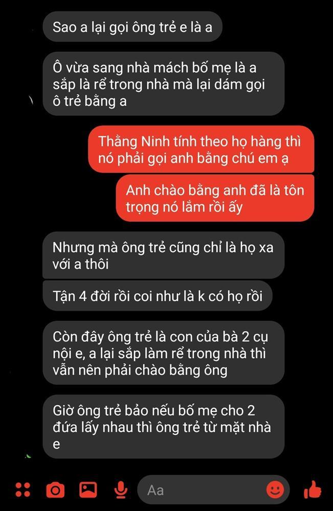 Trong tin nhắn được đăng tải, cô gái trách móc chàng trai: "Sao anh lại gọi ông trẻ em là anh. Ông vừa sang nhà mách bố mẹ là anh sắp là rể trong nhà mà dám gọi ông trẻ bằng anh". Khi chàng trai phản pháo theo họ hàng bên mình thì ông trẻ kia phải gọi anh là chú và cho rằng việc chào anh đã là một sự tôn trọng.