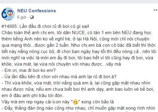 Mới đây có một câu chuyện khá hài hước được chia sẻ trên diễn đàn NEUs về chuyện một chàng trai lần đầu hẹn hò bạn gái. Vì trời quá nóng, tận 40 độ nên anh chàng không nghĩ ra trò gì đành rủ cô gái đi bơi. Và ngay lập tức anh bị cô gái buông những lời chua chát, xúc phạm và bị hủy kết bạn Facebook ngay tức khắc.