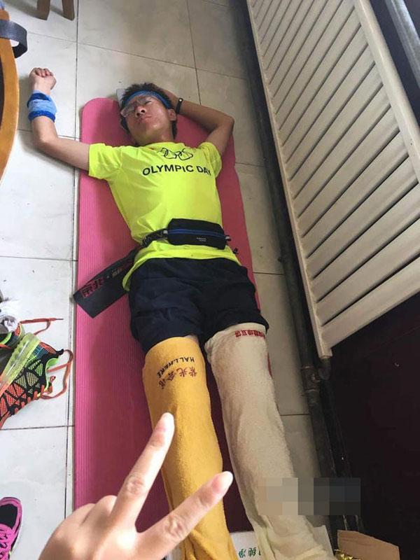 Buồi chiều ngày 19, nhiệt độ tăng lên đến 35 độ C. Liu đã phải nằm xuống và sử dụng khăn tẩm nước đá để làm mát chân.