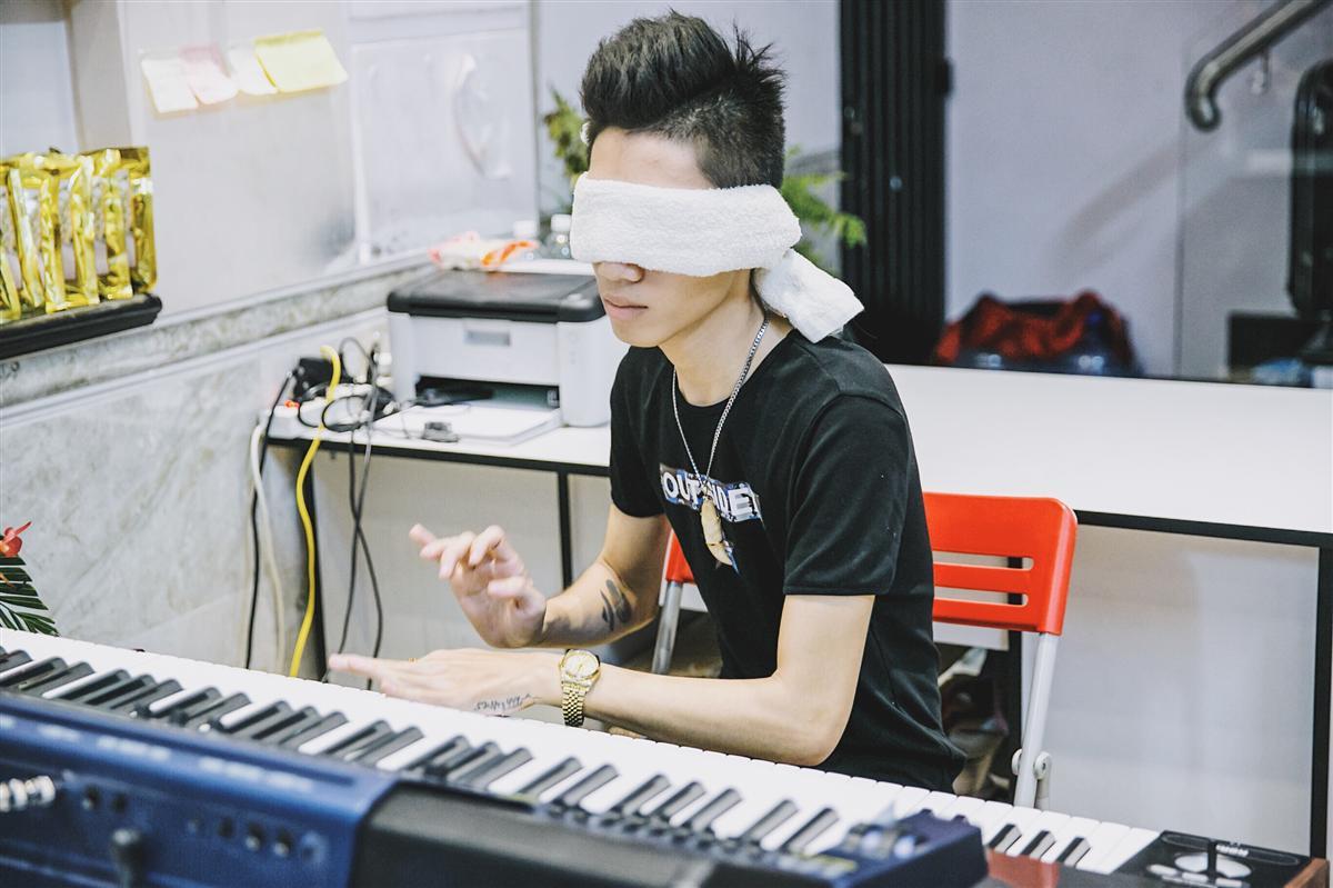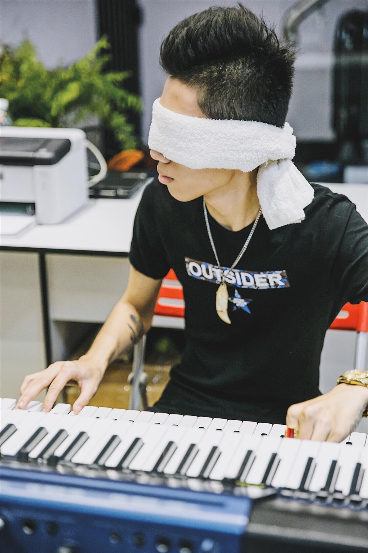 Bảo Khánh bịt mắt chơi đàn điêu luyện.