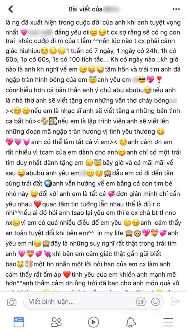 "4 ngày cũng đủ để anh hiểu về em, anh biết rằng em và anh yêu nhau rất thật lòng, rất sâu đậm", "anh muốn hét lên cho cả thế giới biết anh yêu em - my love forever", "Em là tất cả, là trái tim bé bỏng của anh. Bây giờ anh chẳng cần gì ngoài em hết"... là những lời đường mật anh chàng dành cho cô bạn gái.