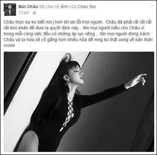 Tuy nhiên vào ngày hôm qua 18/3, Châu Bùi bất ngờ chia sẻ một dòng trạng thái dài với nội dung cô quyết định xin rút lui khỏi The Face năm nay vì 'không sắp xếp được công việc': "Châu xin dừng lại tại top 2 The Face Online! Châu biết sẽ có nhiều người thắc mắc không hiểu làm sao? Sôi máu lên thi... Rồi để mọi người bình chọn... Rồi dừng thi? Làm trò gì vậy? Đó! Cũng vì thế mà mấy ngày nay Châu cố gắng hết sức để giải quyết ổn thoả các công việc cá nhân để có thể bước vào cuộc thi.. Song cuối cùng thì quá nhiều thứ không thể và phải xin dừng lại... một quyết định biết là nói ra sẽ bị mắng, bị chửi, bị trách ... Nhưng bản thân cũng chỉ mong mọi người sẽ thông cảm cho Châu!