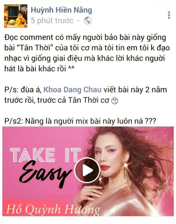 "Không biết mọi người có tin hay không nhưng trên đời này có những thứ gọi là 'trùng hợp ngẫu nhiên' và trong trường hợp này cũng vậy. Khi sáng tác 'Take it easy' Khoa cũng chỉ muốn mang tới một bài hát mang hình ảnh mới mẻ đến cho chị Hương chứ hoàn toàn không đạo nhạc của ai cả", nam nhạc sĩ bộc bạch.