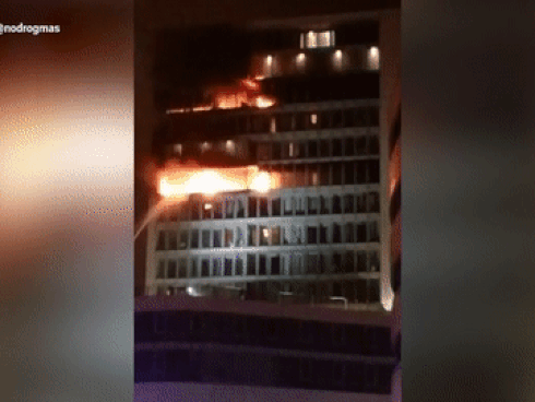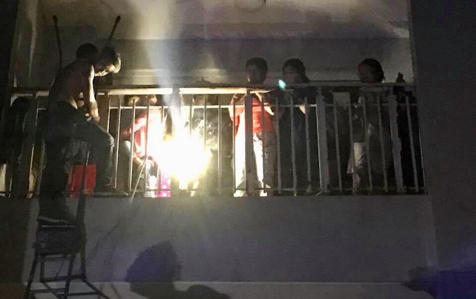 11h56: Lửa bùng phát trở lại dưới tầng hầm chung cư Carina Plaza, người dân hoảng loạn chạy từ tầng cao xuống.