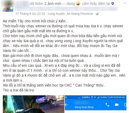 Thật đáng tiếc cho cô gái, cứ tưởng chàng trai vì phải lòng mình nên đành cắn răng về nhà để mượn xe tay ga quay lại rước. Nhưng cô gái nào có biết được, anh ta đã bỏ đi vì quá "sốc", đi luôn không quay lại. Đã vậy, trong lúc cô gái 1, 2 nhắn tin đòi chàng trai quay lại chở về thì anh ta thảnh thơi ngồi nhà, nhắm trà rồi đăng đàn vạch mặt cô nàng trên mạng xã hội.