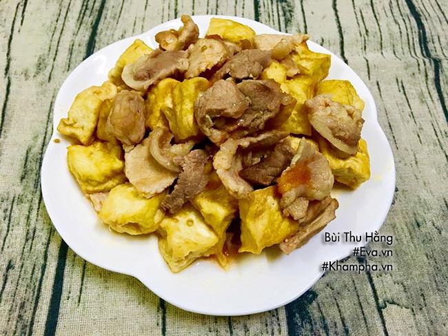 Đậu phụ cắt miếng vừa ăn, chiên vàng. Thịt vai thái mỏng vừa ăn. Cà chua 2 quả thái mỏng, xào nhừ. Cho nước mắm, dầu hào vào chỗ cà chua vừa xào cho vừa vị. Cho thịt và đậu phụ vào đun nhỏ lửa để thịt và đậu ngấm gia vị. Rắc thêm chút hạt tiêu rồi tắt bếp.