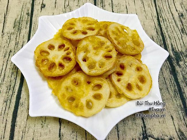 Củ sen gọt vỏ, thái mỏng. Chần qua củ sen trong nước sôi khoảng 5 phút rồi vớt ra. Pha bột chiên giòn với nước rồi nhúng từng lát củ sen vào bột rồi chiên vàng là xong.