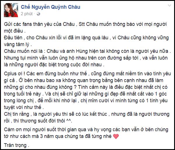 "Đầu tiên, cho Châu xin lỗi vì đã im lặng quá lâu, vì Châu cũng không vững vàng tâm lý. Châu muốn nói là: Châu và anh Hùng hiện tai không còn là người yêu nữa. Nhưng tụi mình vẫn luôn ủng hộ nhau trên con đường sắp tới, và vẫn luôn là những người đặc biệt trong cuộc đời nhau", nữ người mẫu xác nhận.