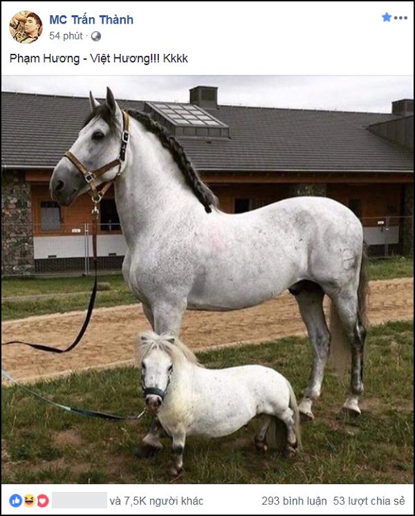 Cụ thể, đăng tải bức ảnh hai chú ngựa có sự cách biệt rất lớn về chiều cao, ngôi sao làng hài liên tưởng ngay đến song Hương của làng giải trí: Việt Hương và Phạm Hương.