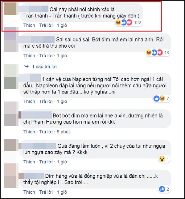 Tuy nhiên, rất không may cho Trấn Thành khi không những chế giễu Việt Hương chẳng thành, nam MC mà còn bị dân mạng "bóc phốt" chuyện chuyên đi giày độn ăn gian chiều cao.