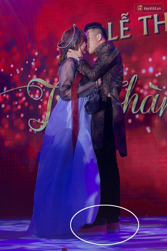 Nhờ có giày độn thì chiều cao của Trấn Thành mới ngang ngửa Hương Giang trong tấm hình này.