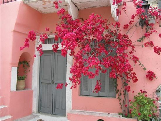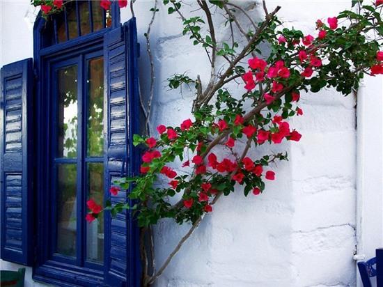Bức tường nhà được điểm xuyết với những bông hoa giấy đỏ bắt mắt tựa như khung cảnh chỉ có trong thơ ca.