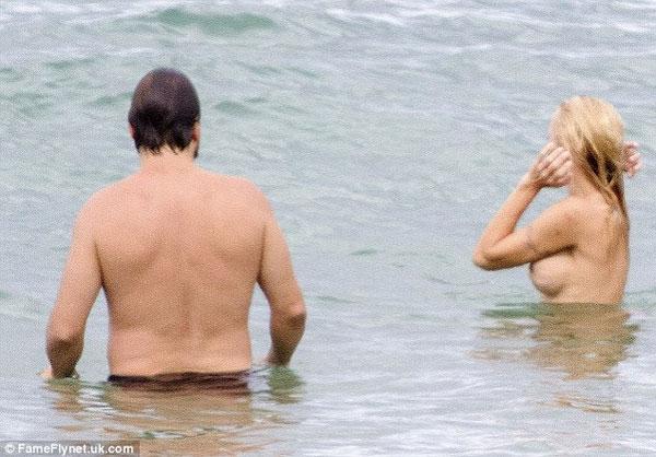 Cưu sưu mẫu "thả rông" ngực tắm biển nhưng vẫn dùng tay che chắn.