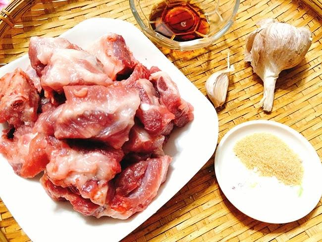- Cho sườn vào tô và thêm 1 thìa nước mắm, 1 thìa nhỏ hạt nêm, 1 thìa dầu ăn rồi trộn đều, ướp sườn 15-20 phút cho ngấm gia vị.