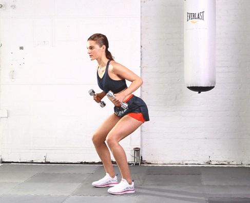 - Bắt đầu ở tư thế ngồi xổm 1/4, hai chân dang rộng, giữ tạ trong tay, lòng bàn tay hướng vào trong.