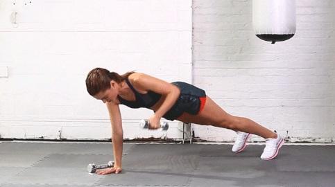 - Bắt đầu ở tư thế tấm ván cao với hai tạ đặt cạnh bàn tay.