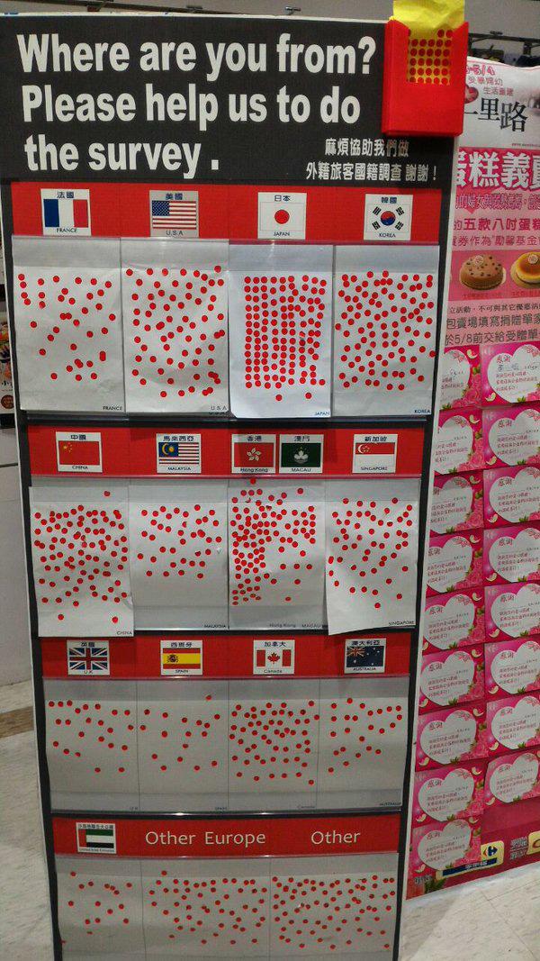 Trên một đường phố ở Đài Loan, Trung Quốc, một bảng câu hỏi được đặt để các du khách tham gia trả lời. Không bàn đến câu hỏi đơn giản: "Các bạn từ đâu đến? Làm ơn giúp chúng tôi thực hiện bảng khảo sát!", cách các du khách dán nốt đỏ vào bảng trả lời câu hỏi mới là vấn đề.