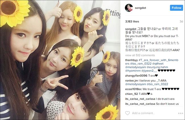 Vài ngày sau khi tin Boram và Soyeon rời nhóm được thông báo, fansite của Soyeon là Songdot đã đăng bức ảnh này cùng chú thích: "Các bạn có tin MBK không? Hay là các bạn tin T-ara của chúng ta?". Boram, Soyeon, Hyomin và Jiyeon đã nhấn "Thích" bức ảnh này.