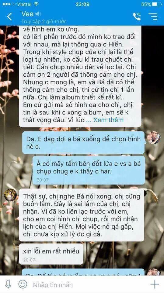Cụ thể, cô không hề từ chối trả tiền bộ ảnh này mà vì hai bên chưa thỏa thuận xong. "Bên phía Vy đòi thanh toán 7 triệu nhưng trong khi đó, phía mình đang thấy Vy không thật sự nhiệt tình nên mình nói gửi trước 4tr. Thiết nghĩ như vậy Vy sẽ làm hình cho mình chu đáo hơn. Trước những ngày đó mình có nhắn tin gọi điện thoại cho Vy nhưng Vy không hề trả lời", và sau đó là đột ngột đăng bài trên Facebook.