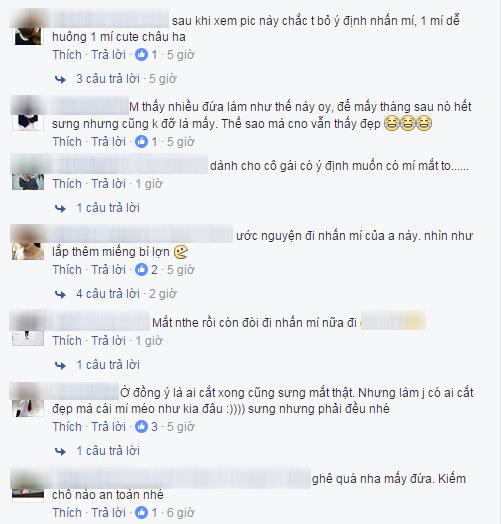 Ngoài những lời nhận xét trêu đùa chiếc mí bị sưng phù thì còn có không ít ý kiến quan tâm, đồng cảm với cô gái tội nghiệp, bởi rõ ràng cô đã gặp phải “lang băm”, tiền mất tật mang, giờ chỉ còn cách đợi hết sưng rồi tính tiếp. Như bạn Tuyết Trần chia sẻ rất chuyên nghiệp: “Thế này là hỏng rồi còn đâu. Nếu mới làm còn sưng thì nó phải tím, đường chỉ cũng không thể bị lệch như kia được. Đằng này đường chỉ lệch lạc, mí mắt nổi cục như kia là làm hỏng mí của người ta rồi”.