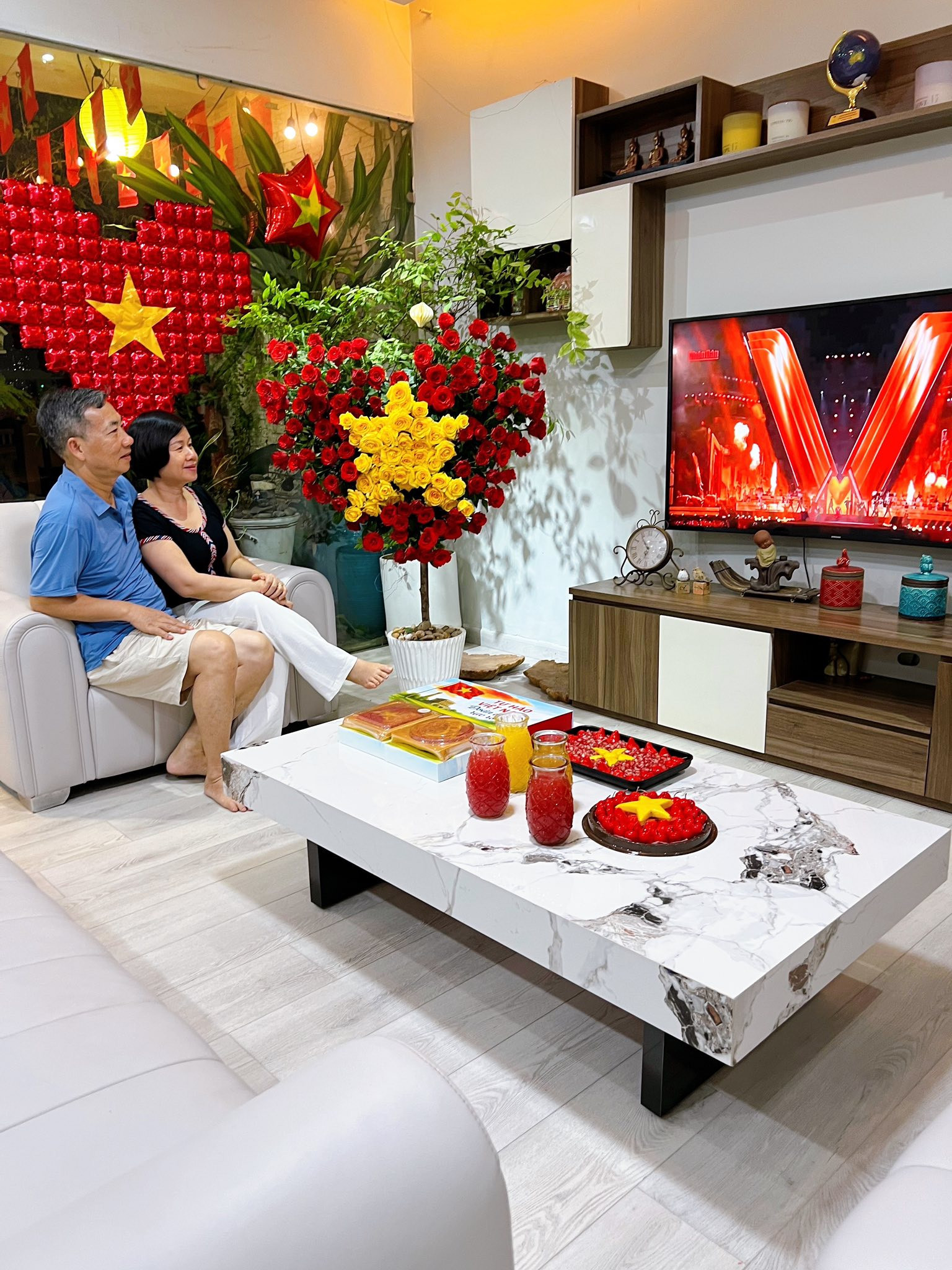 Chị Phương cho biết, cả nhà mất 3–4 tiếng để hoàn thiện, trong đó phần cắm hoa là khó nhất. “Đúng hôm bố mẹ nuôi sang chơi nên ông bà cũng phụ giúp. Cả nhà cùng làm, không khí náo nức, ai cũng cảm nhận rõ tình yêu quê hương, đất nước”, chị kể.