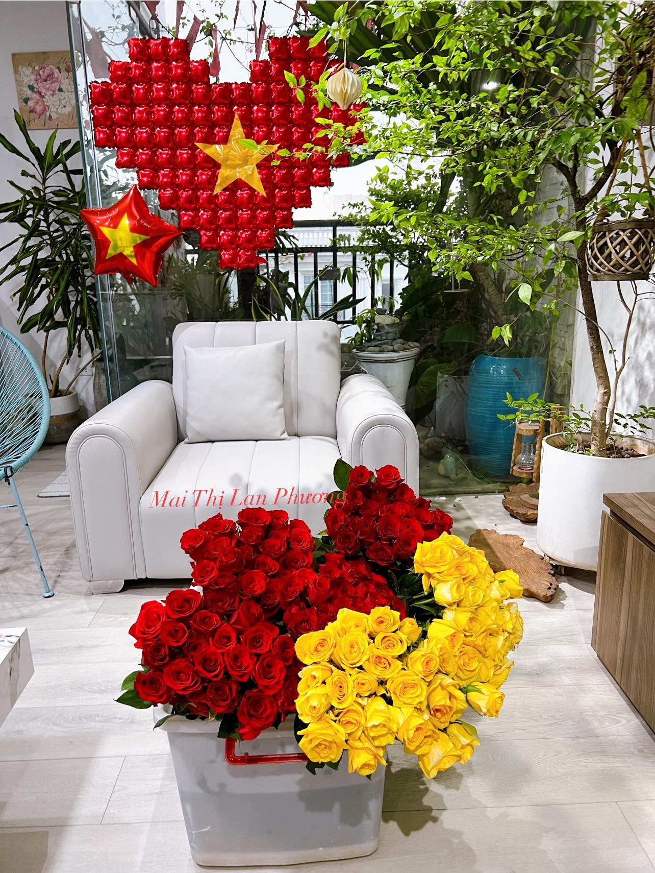 Nhiều gia đình trang trí nơi ở để thể hiện tinh thần yêu nước. Chị Mai Thị Lan Phương (Hà Nội) cùng chồng con đã biến ngôi nhà thành “góc yêu nước” xinh xắn với lẵng hoa hồng đỏ kết thành hình trái tim, ở giữa nổi bật ngôi sao vàng.