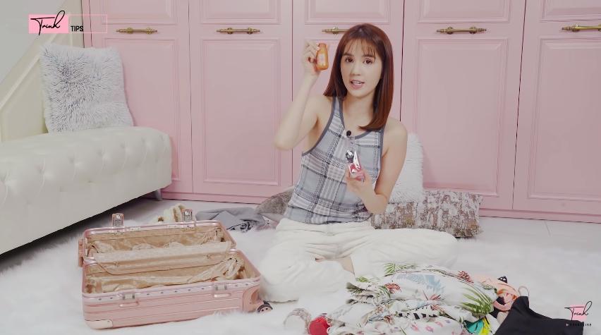 Đầu tiên là mỹ phẩm. Với Ngọc Trinh, rất bất ngờ là "nữ hoàng nội y" chỉ mang theo rất ít mỹ phẩm. Dầu gội, dầu xả, sữa tắm, kem chống nắng và 2 hộp kem dưỡng da ngày - đêm là đủ. Thậm chí Ngọc Trinh còn không dùng toner (nước hoa hồng). Đồ trang điểm cũng chỉ có phấn, cushion, son để luôn trong balo sau lưng. Quá gọn nhẹ phải không?