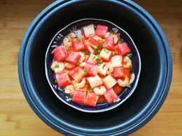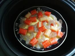 - Sau đó, mở nồi cơm điện ra, cho tôm và thanh cua xắt nhỏ lên trên bát trứng, đậy nắp lại, hấp thêm 5 phút nữa.
