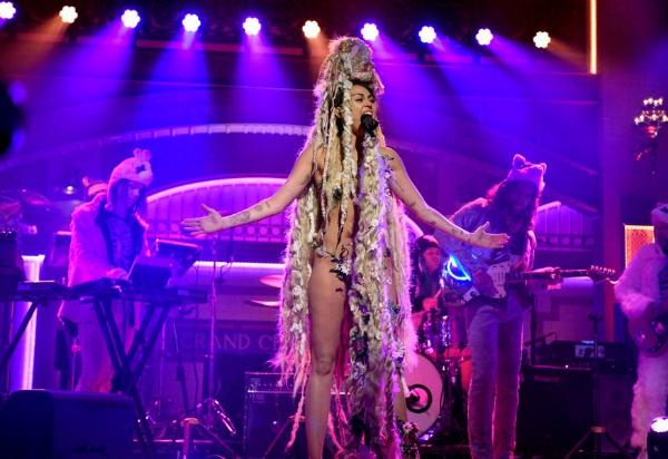 Thoạt nhìn, khán giả dễ nhầm tưởng Miley đội "thủ lợn" lên đầu.