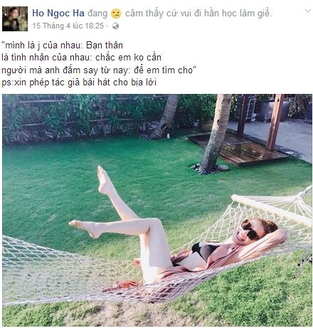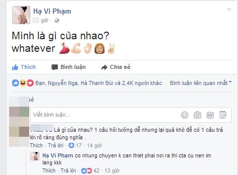 Không chỉ có Hạ Vi, Hồ Ngọc Hà trước đó cũng bộc bạch tâm tư trước câu hỏi gây bão của người cũ. Đang tận hưởng kỳ nghỉ bên con trai Subeo, nữ ca sĩ hào hứng đăng tải tâm trạng: "Cứ vui đi hằn học làm gì". Tuy nhiên, giọng ca Xin hãy thứ tha lại có câu trả lời tự tin thay vì phân vân như Hạ Vi. "Mình là gì của nhau: bạn thân. Là tình nhân của nhau: chắc em không cần. Người mà anh đắm say, từ nay: để em tìm cho", Hà Hồ viết.