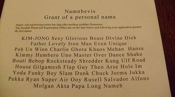 Với họ và tên dài tổng cộng 64 từ, anh chàng người Thụy Điển "Kim-Jong Sexy Glorious Beast Divine Dick Father Lovely Iron Man Even Unique Poh Un Winn Charlie Ghora Khaos Mehan Hansa Kimmy Humbero Uno Master Over Dance Shake Bouti