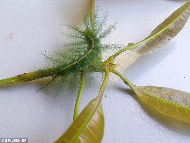 Và rồi bạn sẽ phát hiện thấy có một chú sâu bướm đang ẩn mình rất kĩ ở trên chiếc lá xanh này.