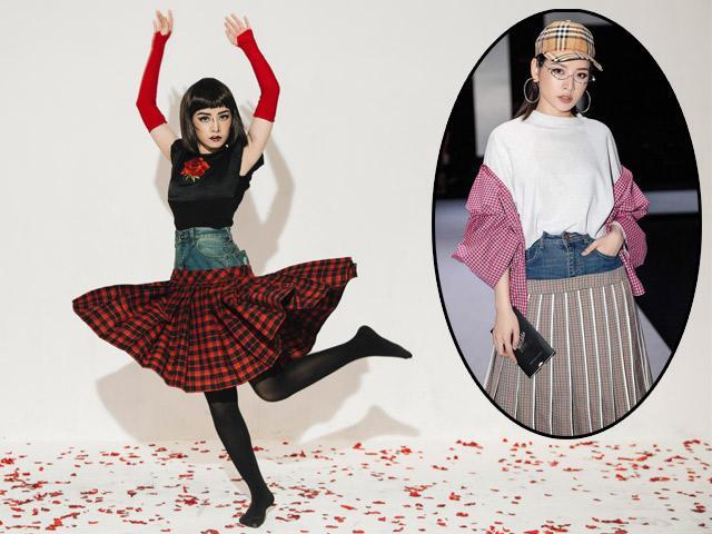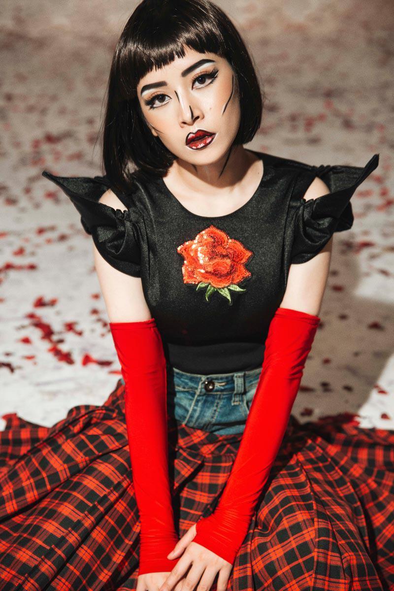 Cô thay đổi chất liệu của phần vải ca rô và đổi thành tông màu đỏ, thêm găng tay đỏ và kết hợp cùng chiếc áo cách điệu thú vị, được thêu hoa hồng chủ đạo ở trước ngực.