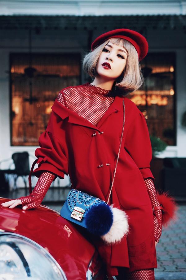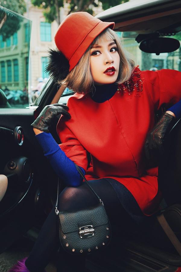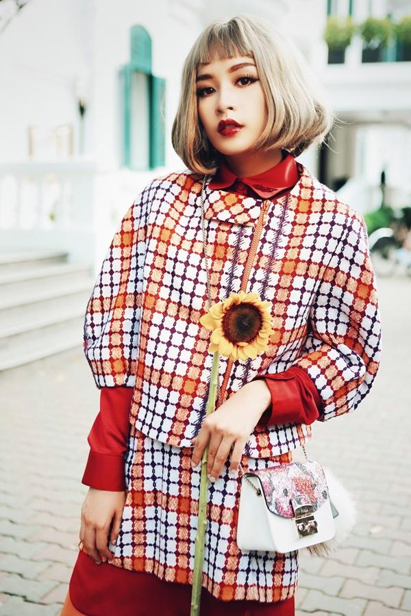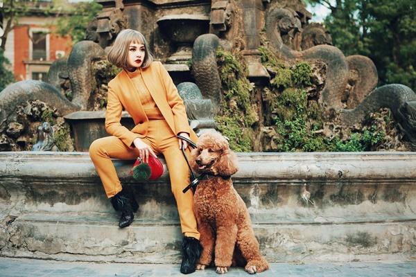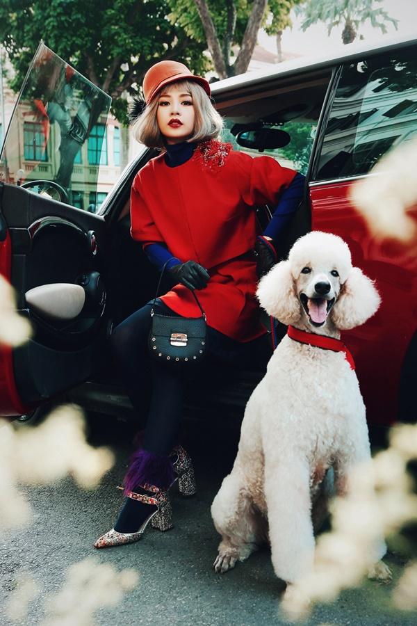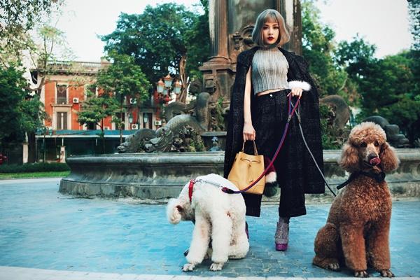 Trong bộ ảnh mới mùa xuân này, Chi Pu một lần nữa tái hiện lại hình ảnh sang chảnh khi diện các thiết kế trong bộ sưu tập "Emo in love" của Xuân Lê bước xuống phố Hà Nội. Người đẹp phim 'Vệ sĩ Sài Gòn' đội tóc giả bạch kim, trang điểm ấn tượng, hoàn toàn khác với vẻ trong sáng thường thấy của cô. Chi Pu còn dắt hai chú cún cưng, mỗi con có giá khoảng 1.000 USD.
