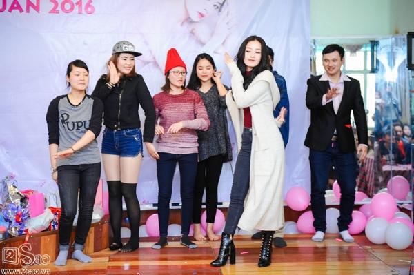 Ngoài thời gian tâm sự, Chi Pu không quên "quậy" nhiệt tình cùng các khán giả Hà Nội khi hăng hái tham gia trò chơi hai người ba chân đạp bong bóng. Chi Pu còn hào hứng khoe giọng hát khi trổ tài thi karaoke cùng fans.