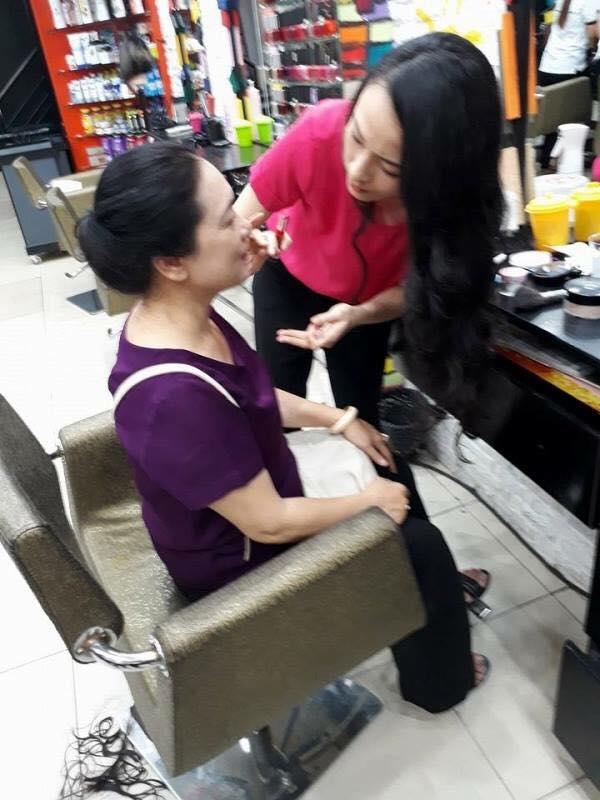 Phương Nga trang điểm cho mẹ trước khi ra ngoài