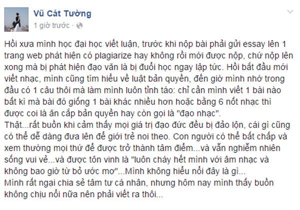 Khi sự việc đang “nóng rẫy” trên mọi mặt báo và mạng xã hội, Vũ Cát Tường bất ngờ lên tiếng, ẩn ý chê Sơn Tùng đạo nhạc. Trên trang cá nhân, cô viết: "Chỉ cần mình viết 1 bài nào bất kì mà bài đó giống 1 bài khác nhiều hơn hoặc bằng 6 nốt nhạc thì được coi là ăn cắp bản quyền hay còn gọi là đạo nhạc… Thật rất buồn khi cảm thấy mọi giá trị đạo đức đều bị đảo lộn, cái gì cũng có thể dễ dàng đưa lên để giới trẻ noi theo”.