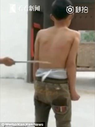 Cậu bé 12 tuổi kêu khóc vì đau đớn, khi người mẹ dùng roi đánh liên tiếp lên lưng trần của con trai. Lưng cậu bé hằn rõ những vết màu đỏ và tím.