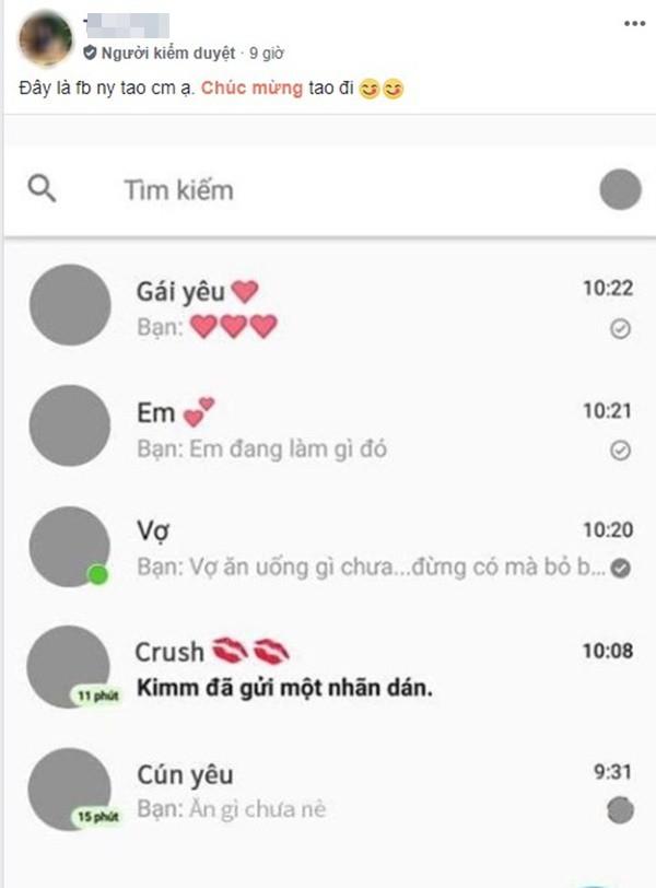 Hình ảnh ghi lại, dù tên Facebook đã được xóa đi nhưng chủ nhân của chúng cùng lúc đã chat với rất nhiều cô gái. Với mỗi cô, anh chàng này lại dùng một tên gọi khác nhau như "gái yêu", "cún yêu", "crush",... để tránh nhầm lẫn.