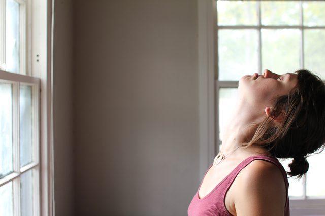 Hãy tưởng tượng bạn đang bĩu môi, cố gắng đưa hàm dưới ra hết cỡ, nghiêng sang phải và ngửa cổ lên để nhìn thẳng lên trần nhà. Lặp lại 3 lần và làm tương tự với bên trái nhé. Cơ cổ của bạn sẽ được giãn ra hết mức đấy. Vì hình thù của tư thế này, tốt nhất bạn nên tập động tác này khi ở một mình thôi nhé!