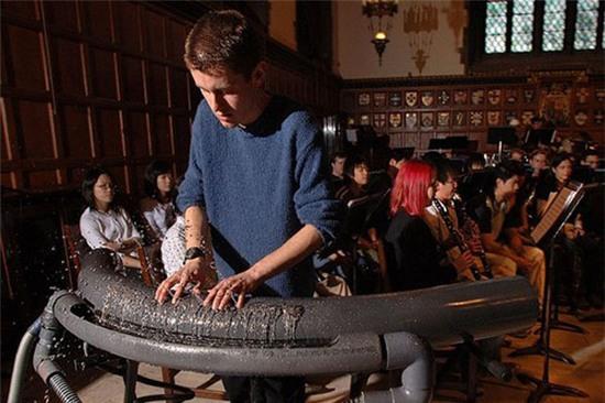 Tác giả của những chiếc kèn vô cùng sáng tạo này là ông Bart Hopkin. Nhạc cụ được làm từ các ống lò xo kín co dãn linh hoạt (thường được tìm thấy trong các bệnh viện hoặc nhà xưởng) với độ dài khác nhau được được gắn vào một đoạn thân ngắn hình chiếc kèn với lỗ thổi phía trên. Để sử dụng nó, đầu tiên người chơi cần để miệng vào phía trên của kèn đồng thời để các ngón tay bịt các lỗ dưới của ống lò xo. Mỗi khi thổi, người chơi cần khéo léo thả các lỗ dưới của ống lò xo để tạo ra âm thanh vui nhộn. 6. Đàn Hydraulophone