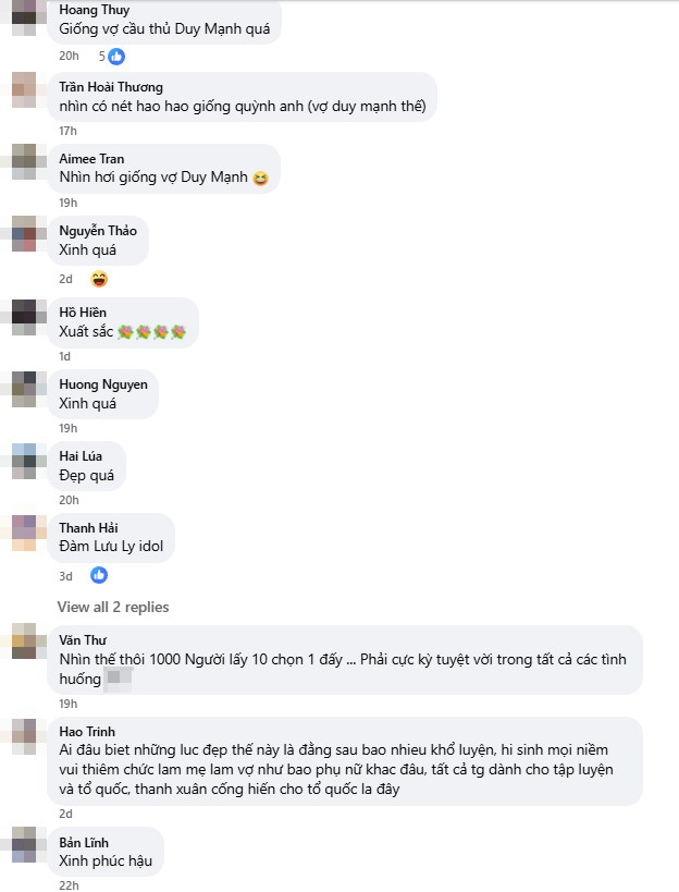 "Nhìn có nét hao hao giống Quỳnh Anh (vợ Duy Mạnh) thế", "Nhìn giống vợ Duy Mạnh", "Xinh quá", "Đâu ai biết để có những lúc đẹp thế, đằng sau là bao nhiêu khổ luyện, hy sinh... Tất cả thời gian họ dành cho tập luyện và phục vụ Tổ quốc. Thanh xuân cống hiến cho Tổ quốc là đây",... là những bình luận để lại.