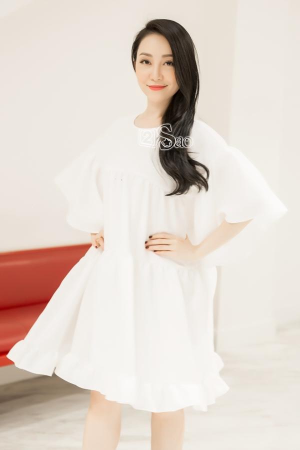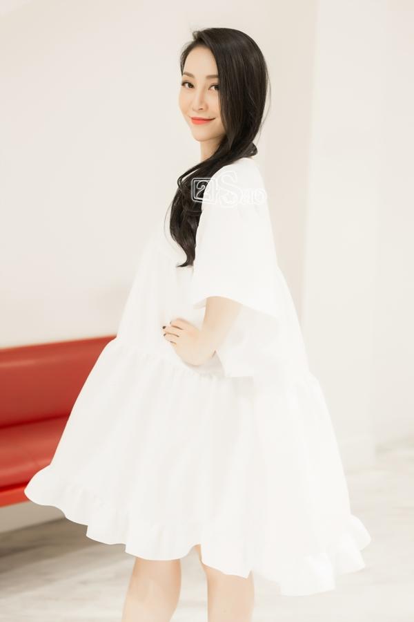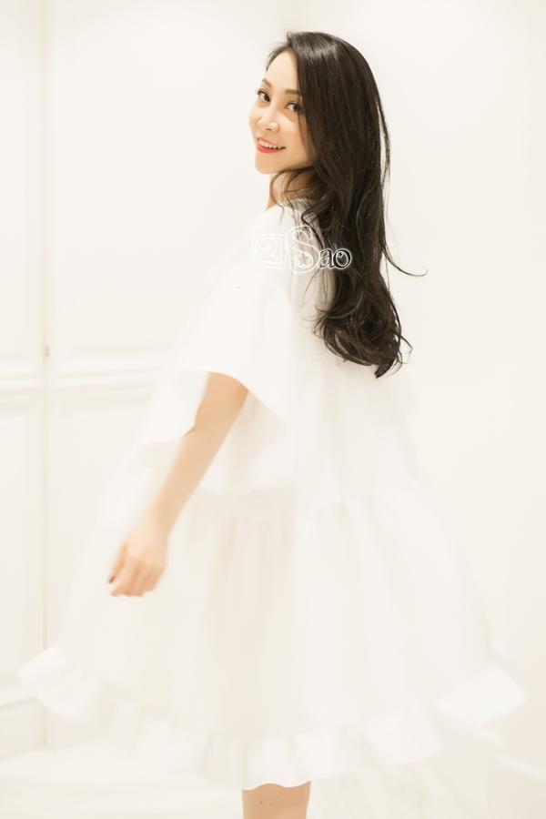Linh Nga trẻ trung như thiếu nữ với thiết kế phom rộng, khiến người xem liên tưởng đến mây trời bồng bềnh hay những con sóng bạc đầu giữa trưa hè oi ả.