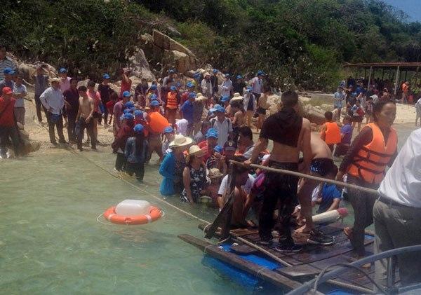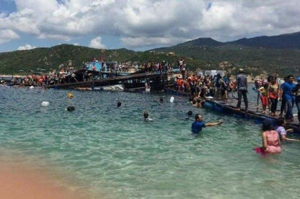 Anh Mạnh Cường, du khách TPHCM cho biết: "Khi chúng tôi đang ngồi ăn thì xảy ra tình trạng rung lắc, ai cũng nghĩ là sóng biển. Vài giây sau, bất ngờ một phía cầu tàu đổ sập, khách bị kéo tuột xuống biển, cả nhà hàng nổi trên biển như phao... Lúc này có khoảng 200 khách đang ăn, trong đó có rất nhiều trẻ em rơi xuống nước".