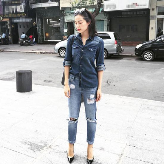 Thời trang denim on denim cũng được cô lăng xê nhiệt tình. Cô mix cả bộ denim